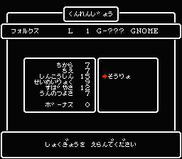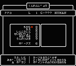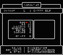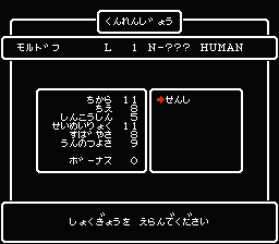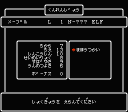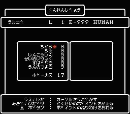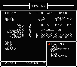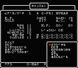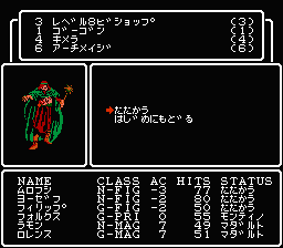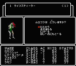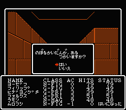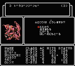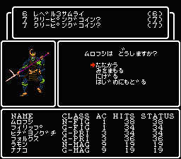 マイルフィックの攻撃がNOGUCHIに炸裂、本企画初の3レベルエナジードレインの餌食になった。前回書いたようにレベルアップ目前だったのでショック倍増、HPが見るも無残な40台にまで落ち込んだ。しかしエナジードレインで落ち込んでいる場合では無かった。ポイゾンジャイアントのブレス次第ではまた全滅である。先制攻撃を凌いだところでNOGUCHIとフォルクスが死亡した。前回の全滅の時はここでマロールを選んで失敗したので、今回は素直に「逃げる」を選ぶ事にした。どちらにせよ、失敗したら全滅なのだが、今回は逃走に成功し、全滅は免れた。 取り急ぎNOGUCHIのレベルをひとつ上げたが、肝心のHPは伸びず、運の特性値がさらに落ちた。人間にして運の特性値が5である。どれだけツイてないのか。 モルドフ(HP60台)がドラゴンゾンビの先制攻撃で死亡、珍しくブレスではなく直接打撃でやられた。村正を装備しているとはいえどこれしきで死んでしまうようでは、とても最下層で前衛を任せる事は出来ない。NOGUCHI(HP40台)も酷い状態で、こんな些細な事でいたずらに死んでばかりいたら老化ばかり進んでしまう。モルドフは28歳になってしまった。上級職の成長の遅さがネックになる、リセット禁止ならではの状況。リセット有りならエナジードレインを気にせず(むしろそれを利用さえして)上級職を使えるが、リセット無しの場合は、成長の早い戦士を使い続けた方が早く戦力が安定するという奥深さに直面している。 彼等不調の上級職を、成長するまでを粘り強く使い続けるよりも、新たに戦士を登録して一から鍛えた方が戦力の立て直しが早いので、戦士を登録する事に決めた。モルドフは戦士からの転職なので呪文が弱いがNOGUCHIとメイレンは上レベルの呪文まで習得しているので、後衛として起用する事も可能だ。 『サイゾウ』/人間/善/戦士 即戦力を期待したのにボーナスポイント5! 正直ちょっと作り直したくなったが、何とか我慢した。大化けに期待だ。 |
