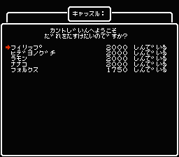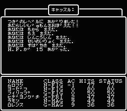 全滅の直後、冷静さを欠いた俺は半ばヤケクソでヨーゼフ独りでB3までダッシュ。B3までの道のりは玄室が無いのでモンスターに遭遇せずに辿り着ける計算が有っての事。果たして怒りのヨーゼフはB3に到着。しかし何処の玄室で全滅したか正確に覚えてない! えいやで直感アタック。今思えばかなり無謀だったが最初の玄室で仲間の遺体を発見(Photo1)。玄室のモンスターが友好的だったのもラッキー。ムロフシ以外の五人を収容し、敵に遭う事無く城へ帰還成功。 金はあるはず・・・と思いきや、一人生き返らせる分しか無かった(Photo2)。まずは僧侶からだと思い、フォルクスを選択。ちょっとしたドラゴンボールな気分。フォルクスの蘇生に成功。 ヨーゼフとフォルクスだけでは心もと無いので救助メンバーを作成する。・・・次回へ続く。 |