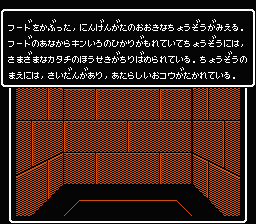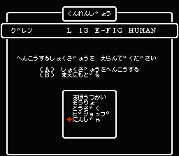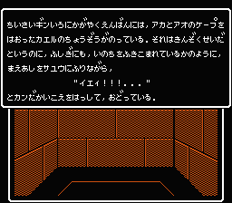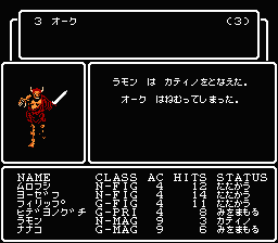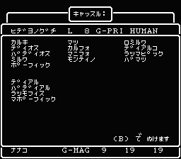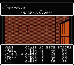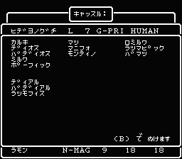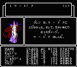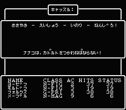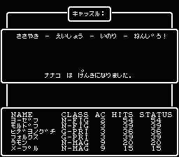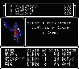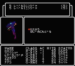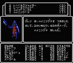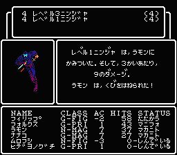 またもや意外な所で惨事は起きた。B4でレベル3忍者が先制攻撃をしかけてきたのである。ムロフシの首が跳ねられた!そしてコマンド入力状態に。まぁマカニトがあるし全滅は無いだろう・・と思ったらヒデヨノグチも死んでいる!?気付かなんだ。ラモン・ナナコのダブルマカニトで何とかこの場は治まってくれ〜。ズギャッ!ラモンも首を跳ねられた!しかもレベル1忍者に!屈辱・・。ナナコが殺られたらヤヴァイ!と戦慄したが今思うとナナコはこの時点で後衛だから平気だった。ナナコのマカニトで何とか勝利。 さぁ馴染みのカント寺院で、まずはレベルアップ目前のヒデヨを生き返らせよう・・あ、失敗。金が無い。次回。 |