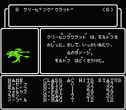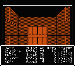 村正の威力に酔いしれる一行が勢い任せに最下層6番目の玄室の扉を蹴破ると、ポイゾンジャイアント4の先制攻撃が待ち構えていた!Wizardry経験者なら御存知の典型的全滅パターン、最悪の状況である。こちらも既にその覚悟である。 4匹中3匹がブレスを吐いただろうか、よく覚えていない。先制攻撃が終わるとNOGUCHIとフォルクスとロレンスは既に赤くなっていた(死亡)。かろうじて耐えたのはムロフシとヨーゼフとラモン。即全滅しなかっただけ大したものである。 「逃げる」か「マロール」かの選択。今にして思えば「マカニト」という選択肢もあった、それだけ慌てていた。このような劣勢の時の逃走は失敗に終わる事が経験上多いので、確実にマロールによる戦場脱出に賭けた。しかし、ラモンがマロールを唱えるより早くポイゾンジャイアントのブレスがさらに2発3発と襲い掛かった。 待つのは確実なる全滅、しかも最下層の奥、おそらく武具は奪われ、何名かロストする者も出るだろう。しかしこれこそWizardryのたる所以、ここからの復興こそ、リセットを絶った者にしか味わえない境地なのだ。 画面には6名の墓標。 こういう時の為に予め悪のパーティを鍛えておいて良かった。さてまずは被害状況の確認から・・・(つづく) |