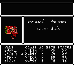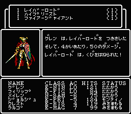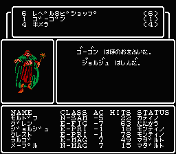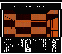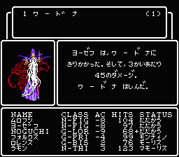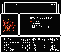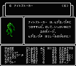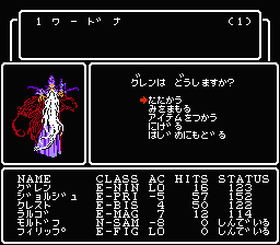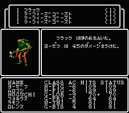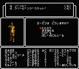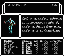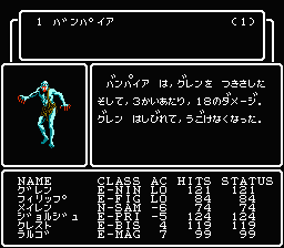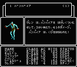 サイゾウがレベル11でHP60と、少々伸びが悪い。レベル7メイジの呪文連発で初の赤い棺桶(死亡→蘇生)に見舞われた。ヨーゼフら古株戦士の高いHPは幾多のエナジードレインから這い上がり続けた賜物だという事を実感。NOGUCHIやモルドフら上級職もこの試練を乗り越えねば高いHPは身に付かないという事だ。しかし毎回の悩みながら戦士と上級職では這い上がる為に必要な経験値が違いすぎる。 即戦力として急ピッチで叩き上げたサイゾウだが、ここで沸々とまた村正の威力を堪能したくなり、モルドフと入れ替えた。するとどうだろういきなり、初戦である、お馴染みのバンパイアの先制攻撃ときたもんだ。モルドフ(LV13→11)ヨーゼフ(LV17→15)、どれだけツイてないのか。善から悪へ編成を変えた後もバンパイアは度々現れては気安く触りやがり、被害はフィリップに集中(LV15→13→11)。あれよと言う間に新入りサイゾウと同レベルにまで落ちてしまった。再び貧弱になったフィリップは、ハタモト(43打撃)とゴーゴン(20ブレス)の先制攻撃程度に耐えられず棺の常連に逆戻り。 バンパイアを何とかしてくれ。 |