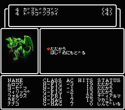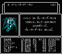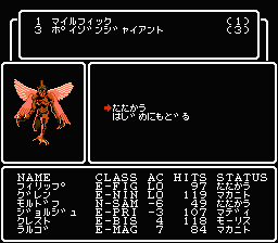 呪文を習得し損なっていても、そのレベルの呪文をどれかひとつでも習得した状態であれば、転職後に再習得出来る事を知った。なのでマロールしか習得出来なかった魔術師マスターのラモンは盗賊に転職した。生粋盗賊ダウドはこれにて御役御免。まぁすぐに悪のパーティからお呼びがかかるだろう。同じ理論で、続いてマスターレベルに到達した魔術師ロレンスは司教に転職した。これでやっとアイテムの識別が出来る。しかし特性値が初期状態まで落ちた序盤は、ラモンはことごとく罠解除に失敗、ロレンスはことごとく呪われたアイテムの識別に失敗した。ムロフシは筋骨隆々の頼もしき戦士に成長した。それは良いのだが信仰心が全く伸びず、侍への転職は当分出来そうに無い状況。フィリップは相変わらず生命力が伸びず、とうとう酒場待機となった。出番は来るだろうか。 そして遂に最下層へ乗り込んだ。メンバーはムロフシ、ヨーゼフ、NOGUCHI、フォルクス、ラモン、ロレンス。大概のモンスターとは充分優勢に戦える戦力が整っている。マスターニンジャにヨーゼフが首を跳ねられたりしたが概ね順調。フラックとレイバーロード、ハイマスターには普通に勝利。但しグレーターデーモンやマイルフィックといった、現時点ではハマンでも使わなければ勝てないようなモンスターからはマロールで脱出した。あと怖いのはポイゾンジャイアントやドラゴンゾンビのブレスの先制。長く戦っているとどうしても被害に遭う(Photo1)。この時はフォルクスとラモンが寺院送りになったが必死マカニトで逆転勝利。代償として莫大な経験値を得た。転職組のレベルが安定したところでグレーターデーモン(3匹)にチャレンジしてみた(Photo2)。フォルクスが死亡したが勝利。フォルクスはHPが低いがおそらく次レベルでガツンと上がると思われる(長年の経験による直感)。 |