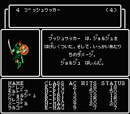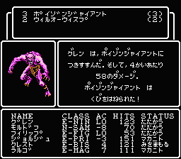 全滅時にカシナートの剣を奪われたヨーゼフだったが、ハイウィザードの宝箱からすんなりと回収に成功した。やはりもう真っ二つの剣では物足りない。 ハイマスター軍の先制攻撃でムロフシがハタモトに首を跳ねられた。何かよく食らうが、守備力が低いのか、しかし悪シリーズで固めたグレンとかも被害に遭ってるから、容赦ないゲームバランスのせいだろう。そしてムロフシはLV15を迎えた所でバンパイアの挨拶に遭い、LV13に戻った。戦士はレベルアップ早いからもう淡々としたもんだ。 不調に苦しむモルドフ、LV13に上がるもHPが7増えただけの67。メイレン、NOGUCHIと並んでHP70前後トリオ、上級職を育てる難しさに直面している。 恒例となりつつあるマイルフィックとの対決。善のパーティで戦うのは実は初めて。ポイゾンジャイアント1を従えていて、マカニトより先に毒ブレスを受けてヒヤリとしたがその後は快勝。村正とカシナートにかかればさすがのマイルフィックも何も出来ずに魔界へ去っていった。その後再度マイルフィック(ポイゾンジャイアント4)と遭遇したが同じように勝利し、守りの盾をゲットした。 エナジードレインで弱体化し、次のレベルまで40万超の経験値が必要だったNOGUCHIが、あと1万で次のレベルに上がるところまで来た。と、そこに、またもやポイゾンジャイアント3の先制攻撃が襲いかかった!なな何と今回はマイルフィック付きだ!・・つづく・・ |