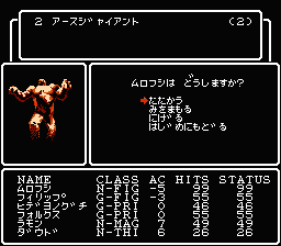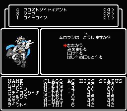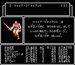 宝箱はそこそこ豊作で、前衛の戦士達に切り裂きの剣が行き渡り、打撃戦の破壊力が大幅に上がった。ダウドは一度も罠解除に失敗しなかった。盗賊なので成長が早く、気が付けばレベル11で、HPもだいぶ増えた。書籍を調べたら、最強の短剣は普通の剣よりも強い事がわかったので、現在売り出し中の悪のパーティのリーダー、忍者気取りのグレンにプレゼントした。まだ司教が居ないので識別はボルタックに依頼しなければならないが、ダウドのお陰でお金が貯まるようになったのでだいぶ資金繰りは楽になった。 待ちわびたアースジャイアント(photo1)に二度、フロストジャイアント(photo2)に一度、遭遇出来た。この喜び久しぶりに味わった。 |