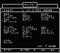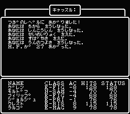 悪のパーティが最下層で死闘を繰り広げた。バンパイアの先制攻撃は本当に勘弁してほしい。今回は2度バンパイアの先制攻撃を受けた(photo1)。1度目でモルドフとジョルジュが、2度目でモルドフとグレンがエナジードレインの被害に。他にはグレーターデーモンとレベル8忍者の先制攻撃でモルドフの首が跳ねられたり損害が絶えないが、挫ける事無く激戦を繰り返し、ラルゴのレベルが上がった。 司教に転職するのに信仰心があと1だけ足りないラルゴ。ここで信仰心が上がれば司教だというのに逆に信仰心を失った!よくある流れでもう慣れた。もう待てないので、ラルゴはこのまま魔術師一筋として、好調僧侶のクレストを司教に転職させた。エナジードレインで中々レベルの落ち着かなかった前衛僧侶ジョルジュを、後衛僧侶に据える事にした。ジョルジュが後衛に入るので、今まで後衛魔術師として悪のパーティを引っ張ってきたメープルを戦列から外した。マスターレベルの魔術師を酒場に置く、選手層が厚くなってきた。ジョルジュが後衛に下がった事で前衛に誰を補充するか。酒場でくすぶっていたフィリップを引き入れる事にした。フィリップはかつて善のパーティで君主への転職を目指していた。しかし生命力の特性値が伸びずいつまでも転職出来ず、生命力不足に伴うHPの低さで最下層での戦いから外され、以来酒場で待機状態が続いていた。そこに悪のパーティから即戦力の戦士としてお呼びがかかった。フィリップは属性を悪に変え出直しを図る。ごちゃごちゃ書いたがつまりはPhoto1の編成からPhoto2の編成に変わったという事である。 HPが68しか無かったフィリップだがレベルが上がると一気にHPが上がった。これで最下層での不安が減った。 |