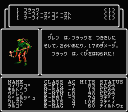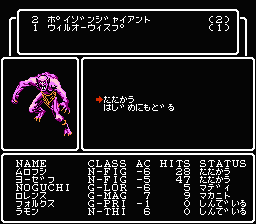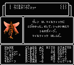 久々の実戦で張り切るフィリップがレベル8忍者に首を跳ねられたり、毎度の雰囲気で最下層での戦いを繰り返していると、マイルフィックに遭遇した。司教に転職したクレストのレベルも10を超え戦力は安定している。いざマイルフィック越えに挑む決心をした。 グレンは窒息の指輪(マカニト)。モルドフとフィリップはマイルフィックに打撃。ジョルジュは賭けでマイルフィックにモンティノ。クレストはマイルフィックにモーリス、と行きたい所だがまだ習得していないのでディルト。ラルゴはマカニト重ねがけ。確実にポイゾンジャイアントを消したい。 こちらの思惑通りにポイゾンジャイアントを消し、モンティノは無効だったがマイルフィックにもある程度のダメージを負わせた。しかしここからである。マイルフィックが何をしてくるか。なんとティルトウェイトを唱えてきた。マダルトくらいで勘弁してくれると目論んでいたが甘かった。大爆発でモルドフが棺桶に入る。ティルトウェイトのダメージは確か10〜150、全滅するには充分の値。しかし他の5人は耐えた。まだ生きている。 グレン97ダメージ フィリップ69ダメージ ジョルジュ93ダメージ クレスト88ダメージ ラルゴ54ダメージ そして2ターン目に突入。ラルゴとジョルジュにマディを掛け、残りは総勢でマイルフィックを攻撃。緊張の戦闘はグレンの一撃(photo1)で幕を下ろしたかに思えた。しかし伏兵ウィルオーウィスプが、マイルフィックを倒した喚起で自分が瀕死な事を忘れていたグレンに襲いかかる。グレン惜しくも勝利に立ち会えず棺桶に入る。かくしてバカデカイ損害こそ被ったが魔神マイルフィックに勝利を収めた。 この後も戦いを繰り返しグレンのレベルが上がり、遂に念願の忍者への転職資格を得た(photo2)。他の冒険者が特性値が思うように伸びず希望の転職が出来ない中で、グレンは非常にバランスよく特性値が伸びた。当然レベルアップ時リセット技などしていないので喜びもひとしおだ。全盛時でHP120超だったがバンパイアのエナジードレインで今は100弱。この恵まれたHPを減らしたくないのでエナジードレインだけは受けたくない。その為にもエナジードレインに耐性を持つ手裏剣を早く手に入れたい。 |