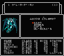 本日は善のパーティを召集。NOGUCHIは君主に転職後、エナジードレインを受けずに着々と経験を重ね、レベル14になった。しかしレベルの低い内に何度かエナジードレインを受けた方が怪我の功名でレベルアップが早く多く出来るので、特に転職後で特性値が低い時には複雑な心境である。生命力が今ひとつで、HPが同レベルの前衛達に比べ6割程度の71しかない。 マスターニンジャの先制攻撃でNOGUCHIの首が跳ねられた。生命力が微妙なのでカント寺院が怖い。無事蘇生したが棺桶状態は極力避けねば。 グレーターデーモン2匹の先制攻撃に遭った。グレーターデーモンはブレスを吐かないので先制攻撃されても余り被害は受けないのだが、今回は後ろにナイトストーカー3匹が控えていた。NOGUCHIがエナジードレインを受けてしまった。LV13のHP65。グレーターデーモンが怖いのでマロールで逃げたかったがそれをすると裏技でNOGUCHIのレベルが14に戻ってしまう。それは本意では無いので正面きって戦う事にした。もしグレーターデーモンが5〜6匹居たなら迷わずマロールしただろう。 今まではエナジードレインを受けてもレベルの上がり易い戦士や僧侶だったのでまだマシだったが、マスターレベル前後の君主や侍がエナジードレインを受けると、取り戻すのは莫大な経験値が必要とする。NOGUCHIは次のレベルまであと40万以上・・・、HP65で40万の経験値を稼ぐのは気が滅入る。 生え抜き戦士ムロフシはLV16まで上がった後、恒例のバンパイア先制攻撃でLV14になった。HPは124あるので頼もしい戦士である事に変わりは無い。残念なのはレベルが上がっても一向に信仰心が増えず侍に転職するメドが全く立たない事だ。 本日最大の喜び、ドラゴンゾンビの宝箱に「ぶき」が入っていた!手裏剣である。ワードナの魔除以外でエナジードレインに耐性を持つ唯一のアイテム。勿論グレンに渡した。エナジードレインを最も受けたくない職業の忍者。これで(グレンだけ)バンパイアに怯えず戦う事が出来る。 |