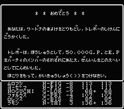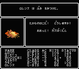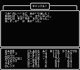 フォルクスはレベル5になるとあっさりディアルコを習得。これでカント寺院の坊主に麻痺ごときで世話にならずにすむぜ。麻痺を克服した事でようやっとB3に足を踏み入れた。何も無いフロアなのだが俺は好きでよく利用する。 最初の玄室を蹴り開けるとレベル3サムライとクリーピングコインの大群に遭遇、ホクホクだ(Photo1)。経験値が高い事を『ホクホク』と言うのはファミコン神拳世代だからかなぁ。 さてこれでヒデヨノグチもレベル8になるだろう。その結果で俺はジャッジしなければならない、ヒデヨノグチを使い続けるかを。「帝大生じゃないと医者にはなれねぇのさ」と酒場で嘲笑され続けたヒデヨノグチ・・・ 何とカルフォとディアルコを一気に習得したではないか(Photo2)。 「オラはハタチで医者だ!」と言わんばかりの大逆転だった。さて戦士ヨーゼフを戻そうと考えてたが、FFPPMMの編成は案外バランスが良いのでこのままの編成で続ける。終盤で強力な武器が手に入るまでは戦士よりも呪文系を置く方が楽だった。ヨーゼフは秘密兵器としてしばらく温存しとこう。 |