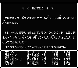 ![]() [本日のメンバー] ムロフシ:ヨーゼフ:NOGUCHI:フォルクス:ロレンス:ラモン ワードナの玄室前。ここまで敵の先制攻撃を受けずに来た事が逆に不安だった。しかしワードナを倒したいという焦りがその不安を掻き消し、善の一行はワードナの玄室に飛び込んだ。 「モンスターはいきなりおそいかかってきた」 凍りついた。何故自分の直感を信じなかったのか悔やんだ。前衛が次々と打撃を受け、ひとりまたひとりとエナジードレインの餌食になった。 敵の先制攻撃が止んだ。被害を見る。前衛は3人とも2レベル低下、不幸中の幸いでワードナとバンパイアロードの悪夢の4レベルエナジードレインは受けずに済んでいた。そして更に幸運な事は誰も麻痺していなかった事だ!前衛のHPがレベルダウンの分だけ軒並み下がったものの、戦闘できる態勢は維持出来ていた! ■1ターン 後衛の魔法攻撃、フォルクスがマリクト、ロレンスとラモンがティルトウェイトを唱え、ワードナの側近達の一掃に成功した。続いてカシナートの剣を装備した前衛3人が一気にワードナに斬りかかった。しかしワードナは防御力が高く思った以上にダメージを与えられない。そしてワードナの呪文攻撃。当然ティルトウェイトも覚悟したが何とモリト。大した被害を受けずに全員生存のまま次のターンを迎えた。 ■2ターン モリトによるダメージは殆ど無いが元々HPの低いNOGUCHIだけ、フォルクスのマディで全快させた。ロレンスとラモンはモーリスを唱え、ワードナの防御力を下げた。続け様に前衛3人がワードナを攻撃。モーリスの効果で前回よりも大きなダメージを与えたものの、ワードナはHPもバカに高く、このターンも耐えられてしまった。そしてワードナの呪文攻撃。当然ティルトウェイトも覚悟したが何とジルワン。全く被害を受けずに全員生存のまま次のターンを迎えた。 ■3ターン フォルクスがイチかバチかのモンティノを試みるが、やはりワードナに無効化された。ロレンスとラモンは前回に続きモーリスを唱え、ワードナの防御力を更に下げた。前衛3人の攻撃よりも先にワードナの呪文攻撃。当然ティルトウェイトも覚悟したが何とジルワン。全く被害を受けずに最後はヨーゼフの斬撃でワードナに引導を渡した。 勝利・・! 前衛3人がエナジードレインの被害に遭ったが、ほぼ無傷での勝利。敵側先制攻撃という不運が代償として後の幸運を引き寄せたのかもしれない。こうして今回ワードナを倒した6人は、めでたく報奨と親衛隊への入隊資格を得たのだった。 次回は悪のパーティでワードナに戦いを挑む! |